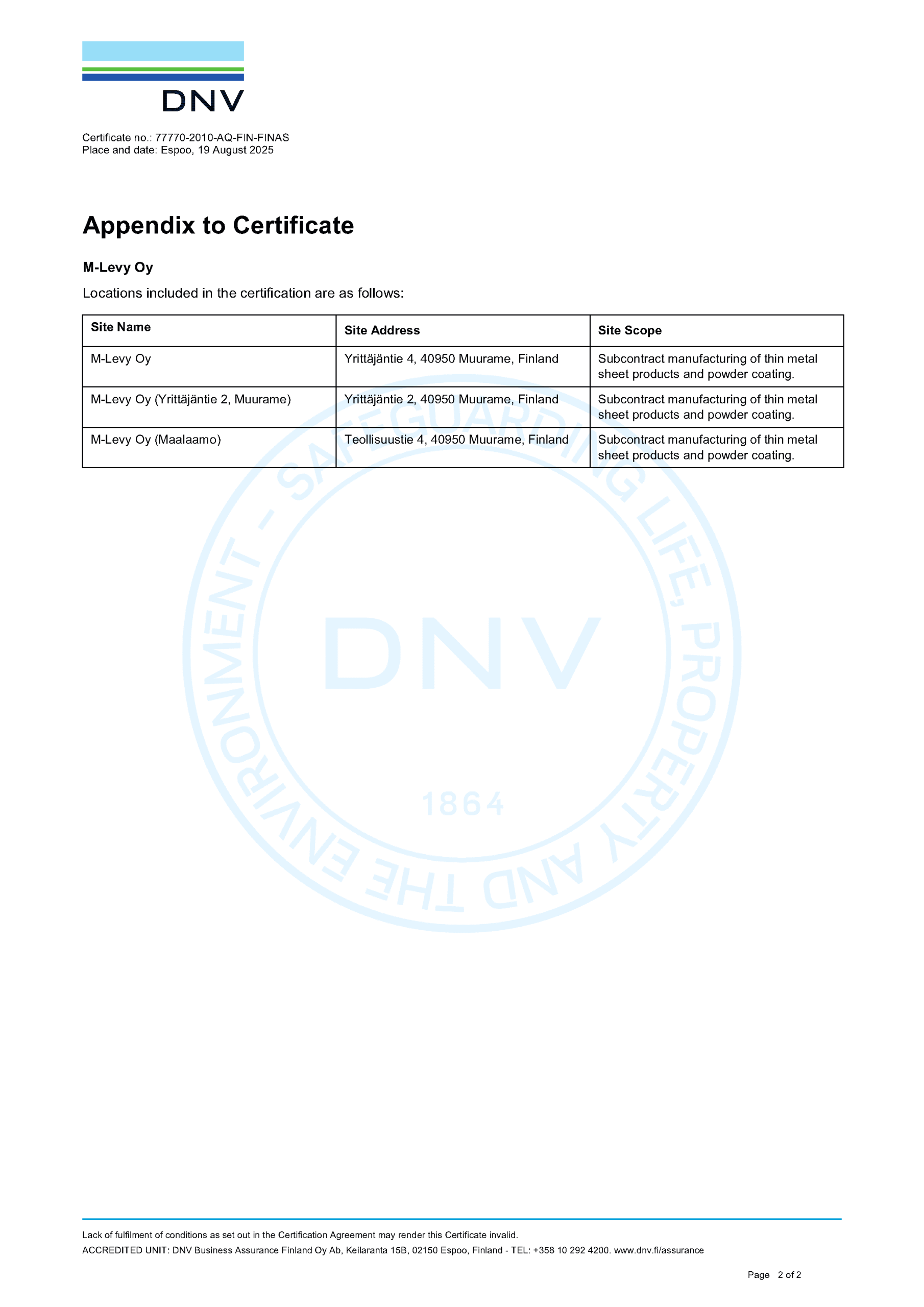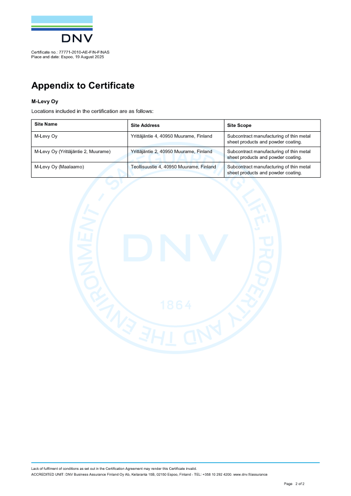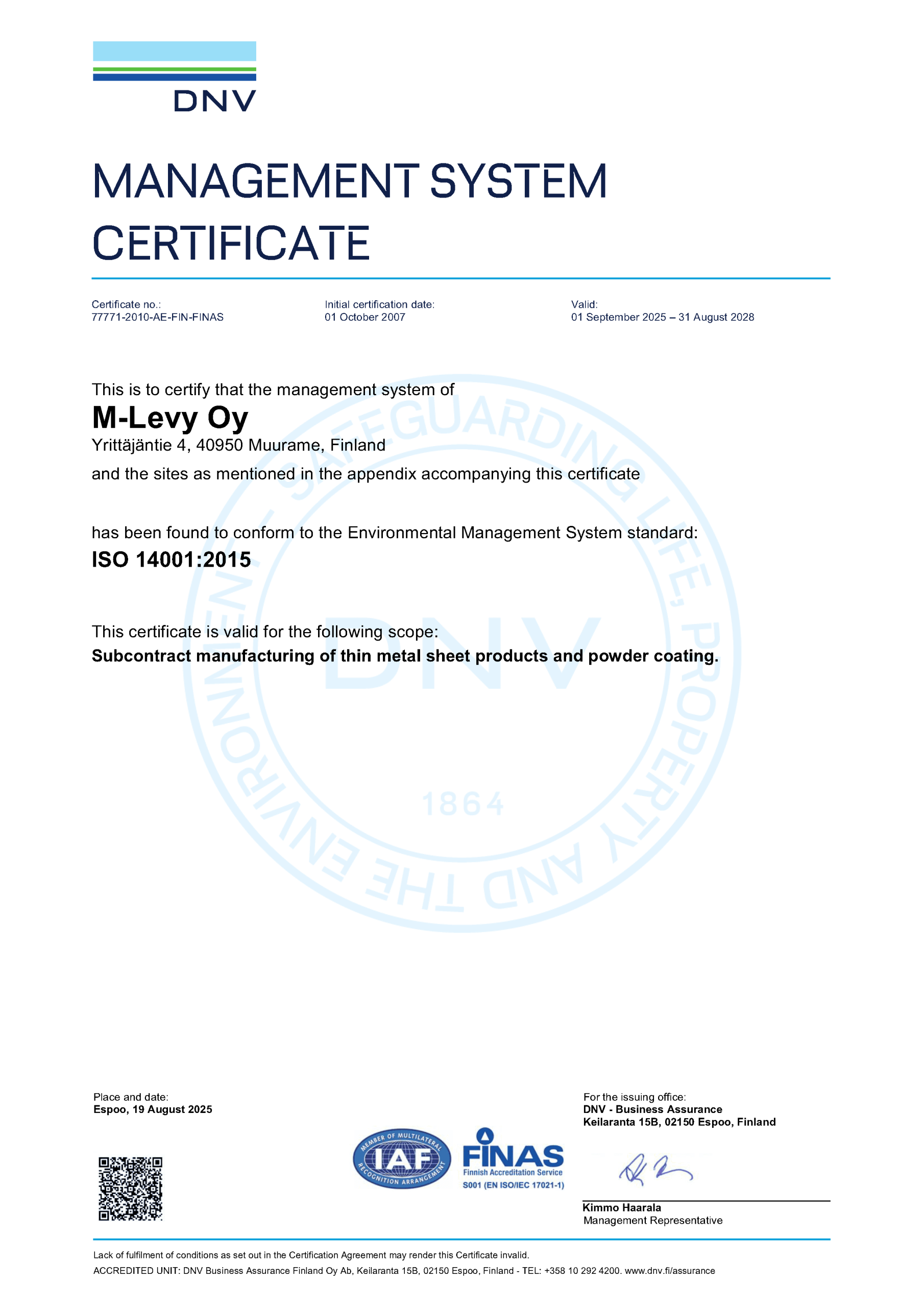 M-Levylle on myönnetty ISO 14001:2015 -ympäristösertifikaatti ja ISO 9001:2015 -laatusertifikaatti.